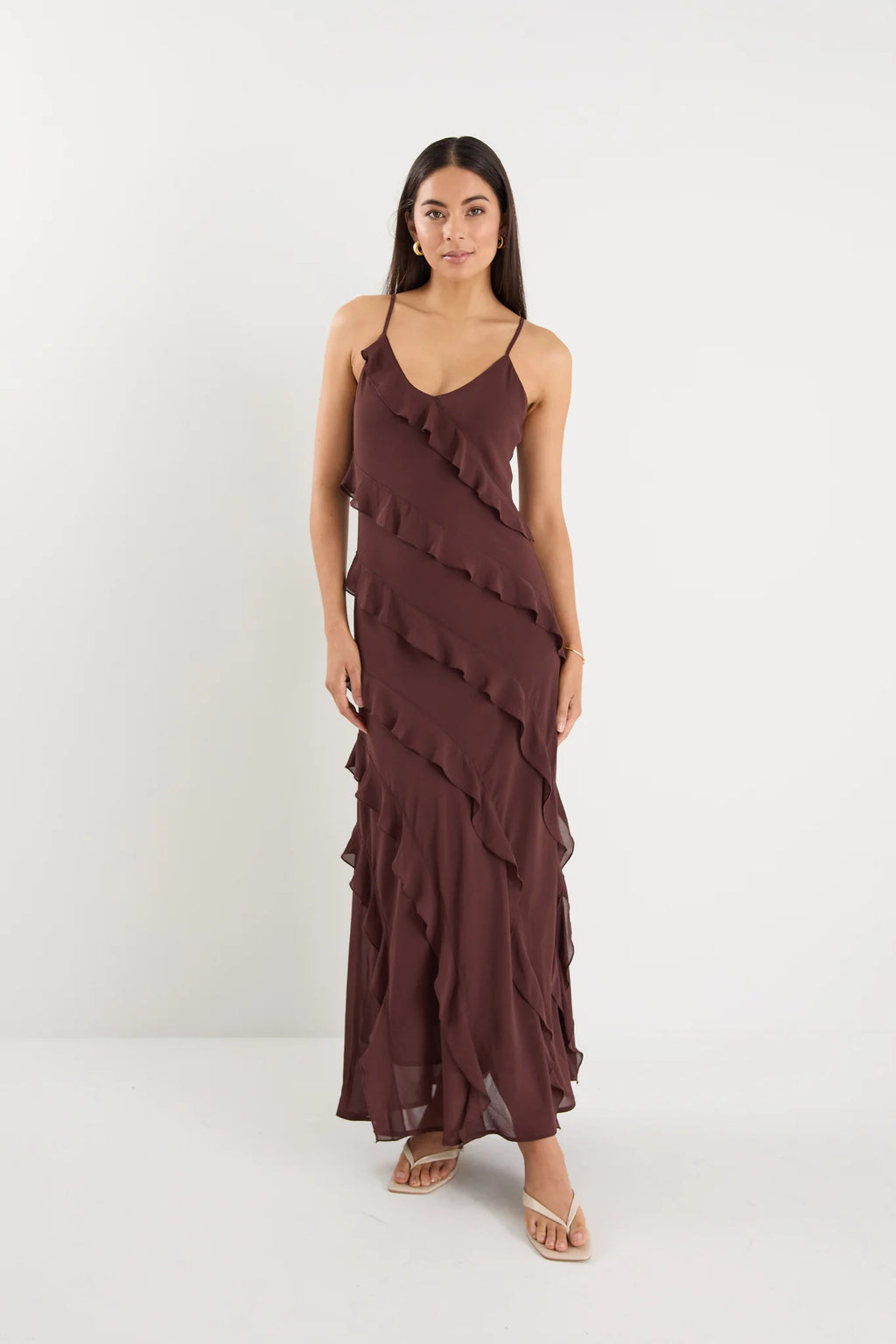 Galore Chocolate Bias Ruffle Slip Maxi Dress - Chocolate